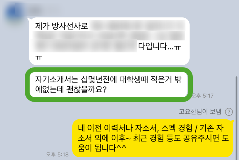 >> 2단계: 이력서 및 자소서 초안 공유: 상담 전에 이력서와 자소서 초안을 미리 공유해주시면, 더욱 심도 있는 상담이 가능합니다.