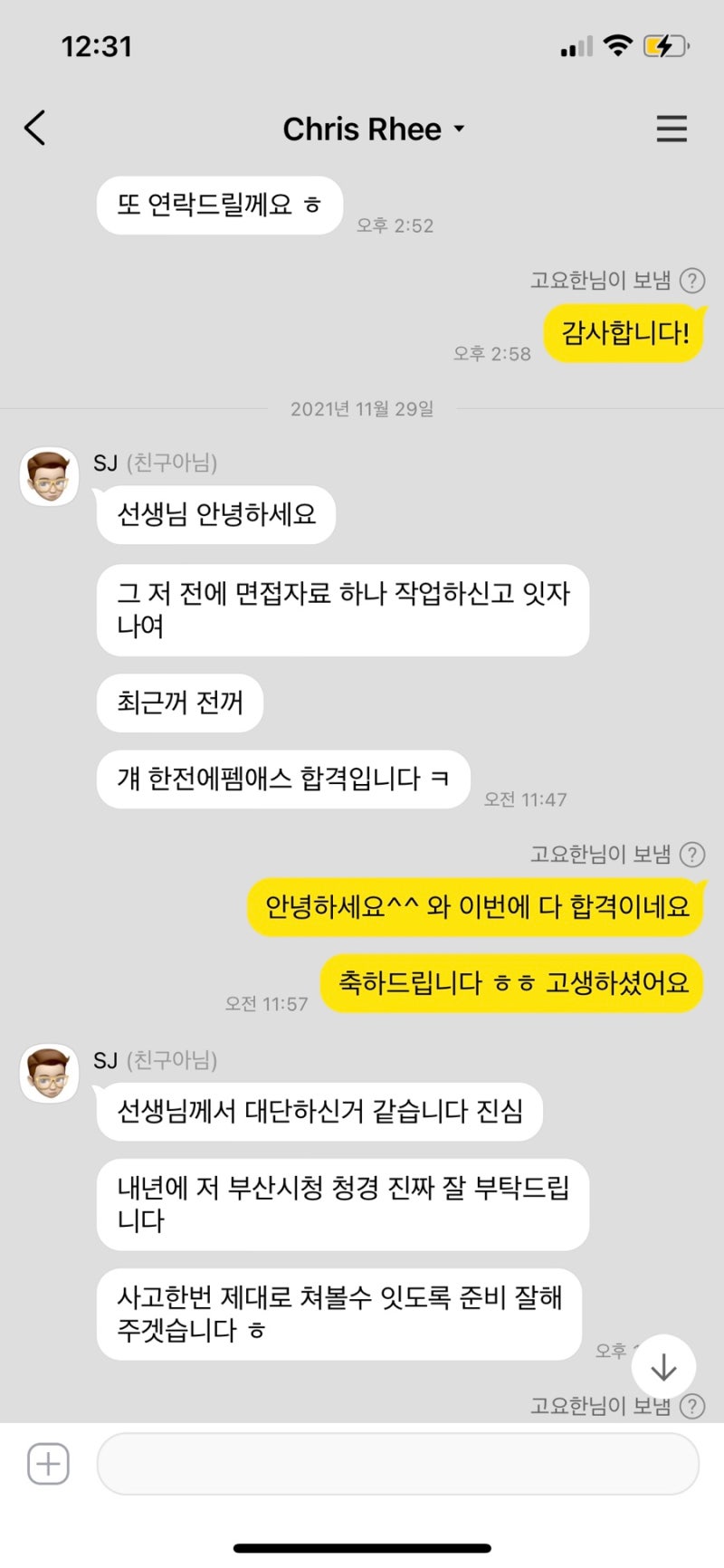 안녕하세요! 👋 오늘은 정말 기쁜 소식을 들고 왔어요. 한전FMS 코스포서비스 특수경비 채용에서 서류합격은 물론, 면접 컨설팅까지 거쳐 최종합격이라는 값진 결과를 만들어낸 지원자분의 생생한 후기랍니다! 제가 직접 첨삭부터 면접까지 함께 하면서 정말 보람이 컸던 케이스예요. 😊