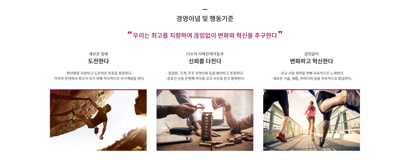 핵심 가치: 혁신, 친환경, 성장, 소통