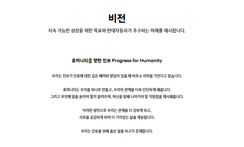 현대자동차는 ‘인류를 위한 진보(Progress for Humanity)’라는 비전 아래, 모빌리티 패러다임의 혁신을 선도하고 있어요.
