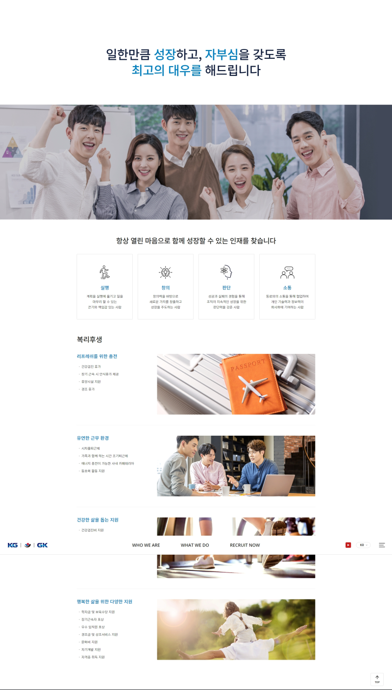 - 인재상: 창의적이고 도전적인 인재, 소통하고 협력하는 인재, 전문성을 갖춘 인재