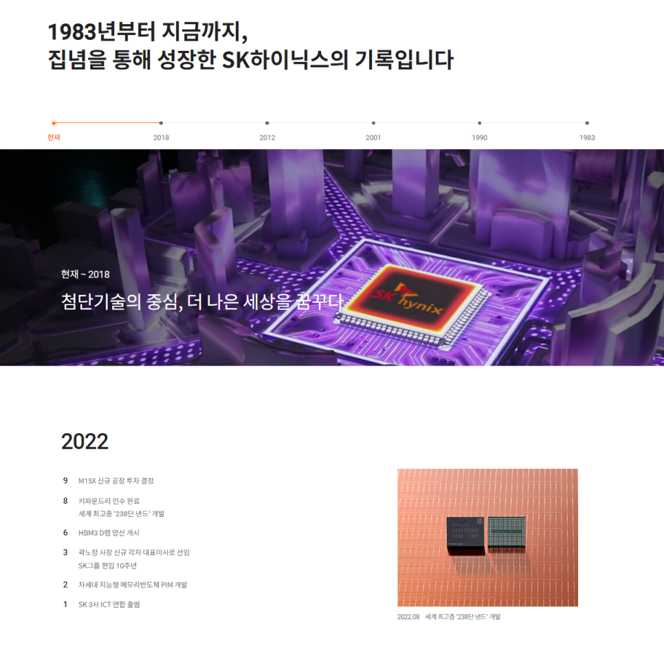 SK하이닉스는 대한민국을 대표하는 글로벌 반도체 기업으로, 메모리 반도체(DRAM, NAND Flash)와 시스템 반도체(CIS) 분야에서 세계적인 기술력을 자랑하고 있어요. 🌐 스마트폰, PC, 서버 등 우리 일상 속 수많은 전자기기에 SK하이닉스의 반도체가 들어가 있죠. 최근에는 AI, 자율주행, 빅데이터 등 4차 산업혁명 시대의 핵심 기술 발전에 필수적인 고성능 메모리 솔루션을 제공하며 끊임없이 혁신하고 있답니다. 단순히 제품을 만드는 것을 넘어, 기술을 통해 인류의 삶을 더 풍요롭게 만드는 데 기여하는 멋진 기업이에요. 😊